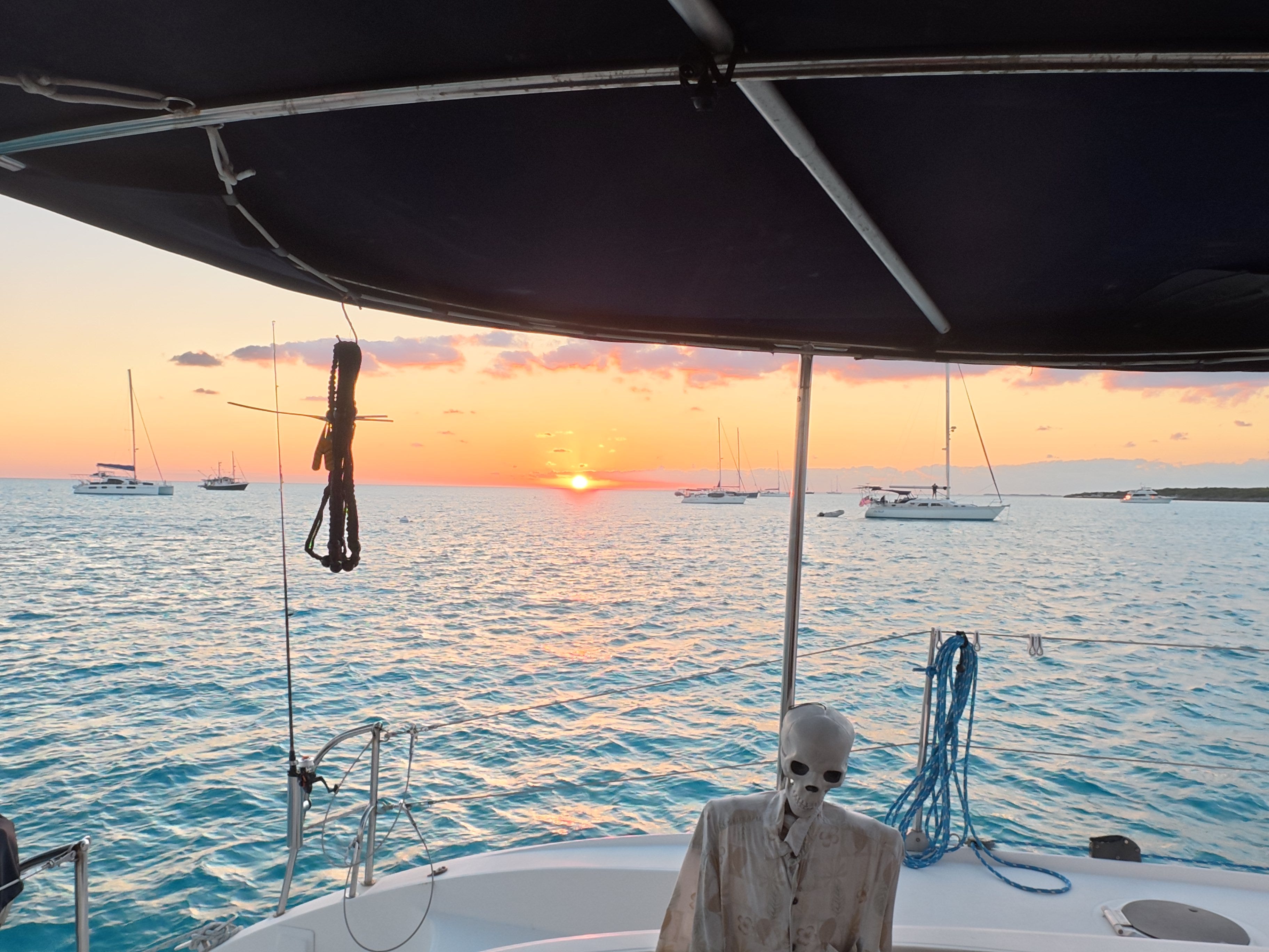We took a bit of a rougher ride than we’d anticipated but we made it. When we dropped our anchor for the week that Saturday afternoon, we were three boats in the anchorage. By the time the week was over, we had learned the hard way to begin recognizing the charter boats. They would swarm in with wildly varying degrees of skill, and consideration for their fellow boaters, some dropping anchors on top of each other (and us). We found ourselves, once again, in a position of having to be alert and aware after the sun went down. We had a boat on both our starboard and port come in and drop anchor just before sundown, in a crowded anchorage, and both of them drug. There was a world of difference between them. On our starboard was a boat that we’d met in the Abacos at New Hope. We said hello, and using the radio we worked with them to try and get their anchor set. They were diligent, they test their anchor and re-anchored three times to try before thinking the anchor was in a good position. When they realized that they were dragging they pulled anchor and moved to another part of the anchorage that was less crowded.